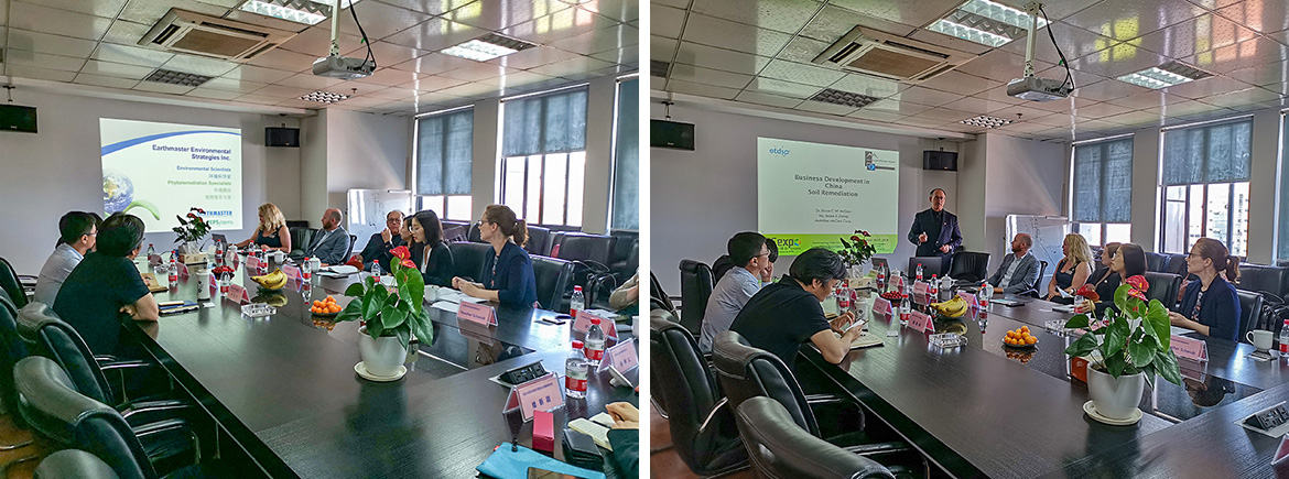 客人也分别介绍了自己公司的情况,Earthmaster业务发展副总裁Amber Flamand介绍该公司是一家专业的环境咨询公司,具有二十余年的发展历史,Earthmaster运营副总裁Adam Dunn详细介绍了公司的主打技术——PEPSystems植物复育法及运用该技术成功修复污染土壤的工程案例。McMillian-McGee总裁Bruce McGee介绍McMillian-McGee是一家专注原位热脱附修复技术的企业,自主研发了多套专利技术进行污染土壤的原位热脱附修复,并在全球范围内获得广泛使用。最后,ng电子游戏团队分别就植物修复和原位热脱附技术与来访公司进行了交流和讨论。