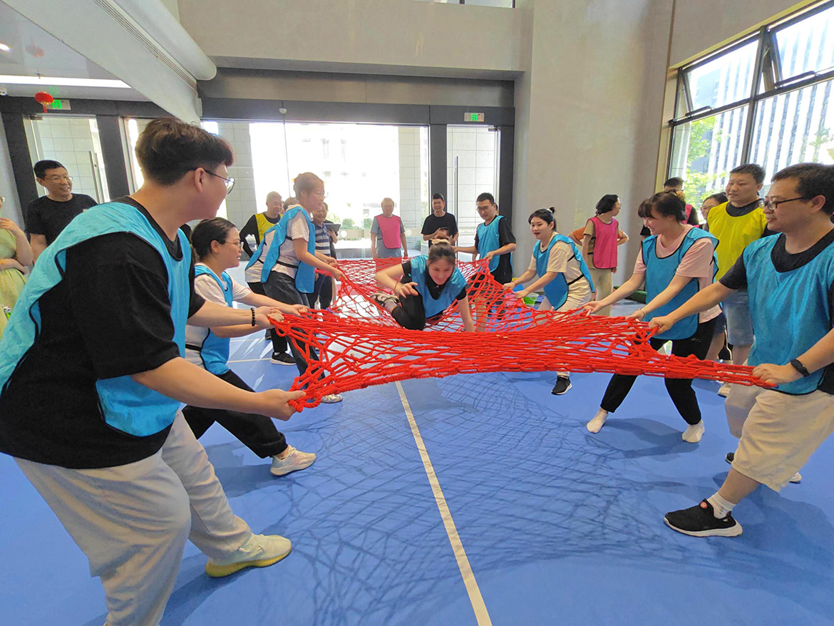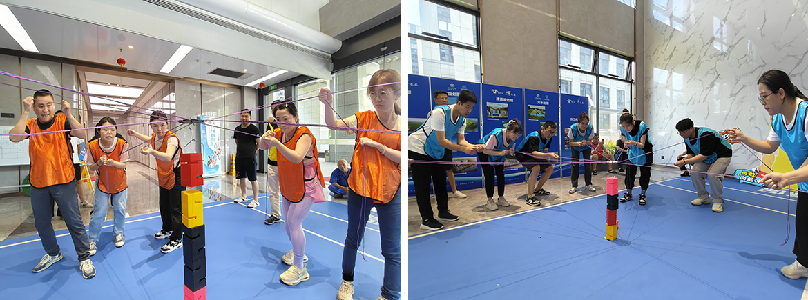 合力搭建延伸出的几条绳子将大家的劲使在一处,心连在一起。齐心协力是必须,百折不挠是常态。现场瞬息万变,引发大家阵阵欢呼。