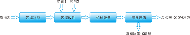 BSH-DeWa? 污泥改性、深度脱水技术采用“化学改性+机械破壁+高压压滤”的组合工艺,其工艺流程如下: