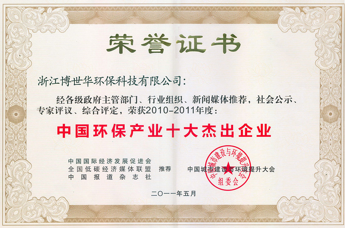 经各级政府主管部门、行业组织、新闻媒体推荐,社会公示、专家评议、综合评定,公司荣获2010-2011年度“中国环保产业十大杰出企业”