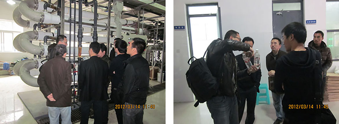 象山考察团边参观边提出了自己的问题和看法,刘经理和王经理非常全面的解答了他们的问题,并向他们展示了分别经过超滤、纳滤、反渗透三套装置处理后的水样进行对比,从外观颜色就可以明显的看出处理效果,超滤产水颜色略黄,纳滤、反渗透产水清澈透明,王经理详细的解释了三种膜的不同结构和处理原理,象山考察团对三套装置的处理效果非常满意,肯定了这一高新技术,计划对象山水桶岙垃圾场的渗滤液处理站进行改造,投资增加安装膜系统,以使渗滤液处理更有效的达到排放标准,对方也期望我公司在投资成本上给予优惠。