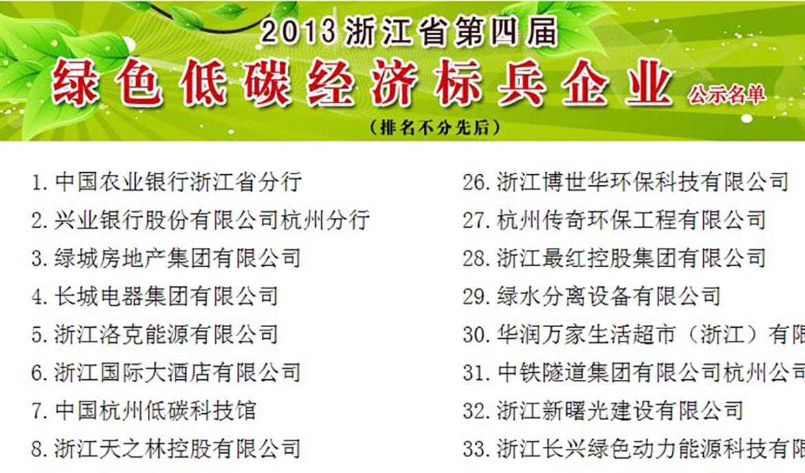由钱江晚报、浙江在线新闻网站、浙江大学经济学院、浙江省企业发展研究会联合主办的浙江省第四届“绿色低碳经济标兵企业”评审会于2013年11月17日落幕,经全体评委评审和无记名投票,在众多入围企业中选拔我省50家第四届“绿色低碳经济标兵企业”公示名单,我公司荣膺50家公示名单之内。