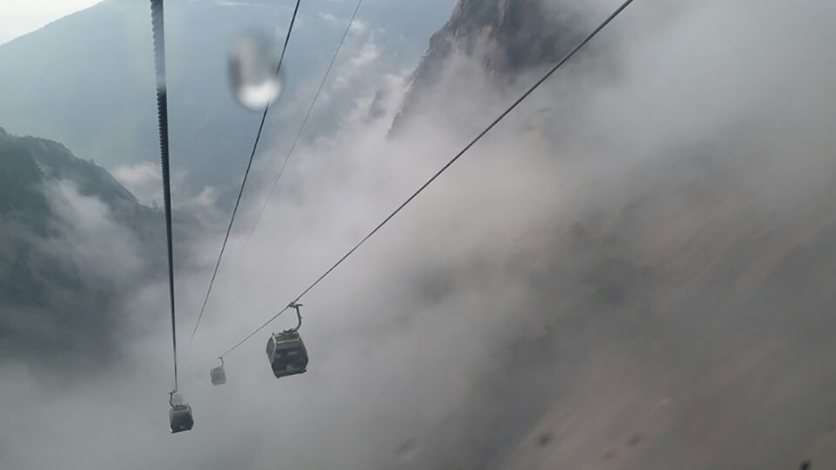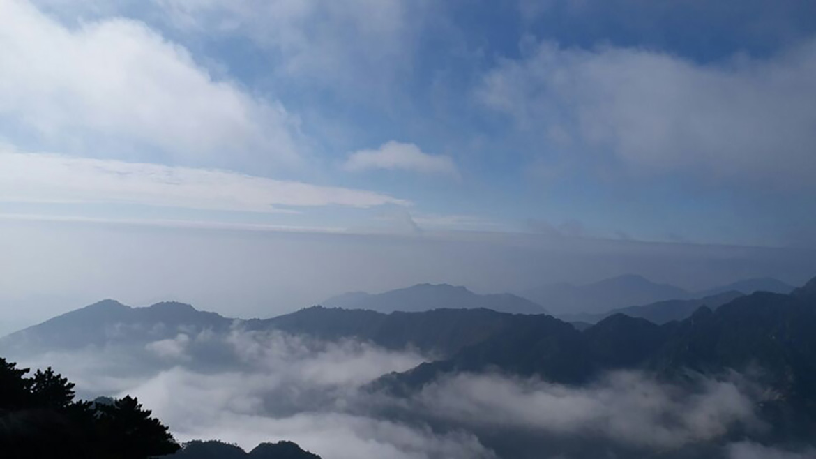 经过漫长的排队等候ng电子终于坐上了上山的缆车。随着缆车的慢慢高升,缆车外雾气越来越深,穿过云层后看到黄山的真面目,黄山上特有的松树正向ng电子伸出手来欢迎ng电子呢! 真是好美啊!
