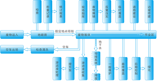 填埋工艺主要有区域法、壕沟法和综合法三种。填埋工艺原则:减少裸露填埋作业面;分层压实;控制污染源头;提前规划填埋工艺。