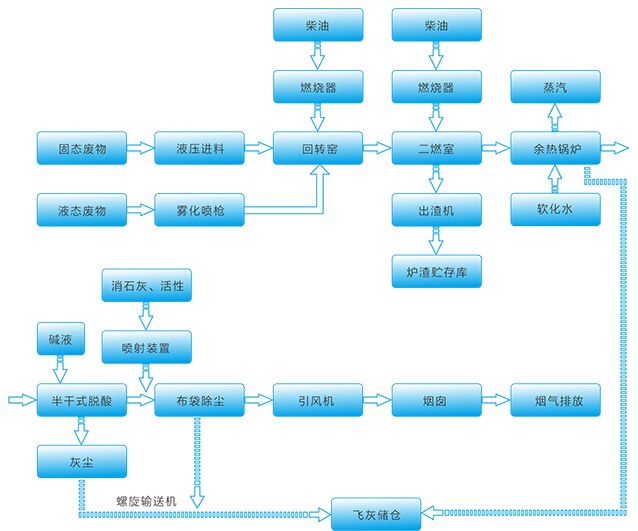 主要焚烧设备:回转窑+二燃室+余热锅炉+尾气处理设备;